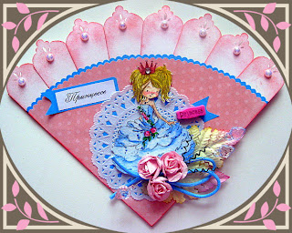 Все мы - королевы! В крайнем случае - принцессы, которые обязательно получат свою королевскую корону! Вон она стоит, приготовлена уже! ))). Вот и открыточка по заданию сложилась у меня вполне "королевишная"! Чудесную картинку с принцессой позаимствовала у прекрасного художника-иллюстратора Lia на сайте www.linmida.com. Так же в ход пошли: бумажка от Docrafts Papermania, х/б кружево, атласные ленты, вощеный шнур, бумажные розы, полужемчуг, тычинки, жидкий жемчуг. Королевская корона - подвеска покрыта золотым акрилом. Им же (для пущего блеска) подрисована маленькая "принцессная" корона на девочке и складочки на ее платье. Еще присутствует много-много машинной строчки! Ну и надпись соответствующая! )))
