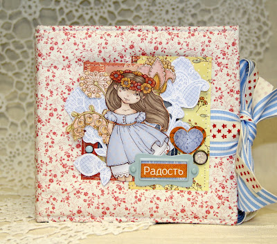 с изображением вышесказанного. В работе использовала бумагу Scrapberry's, цветы, плоттерную вырубку, кружево, вырубку, брадсы, грунт, вырезанные из скрапбумаги цветы.